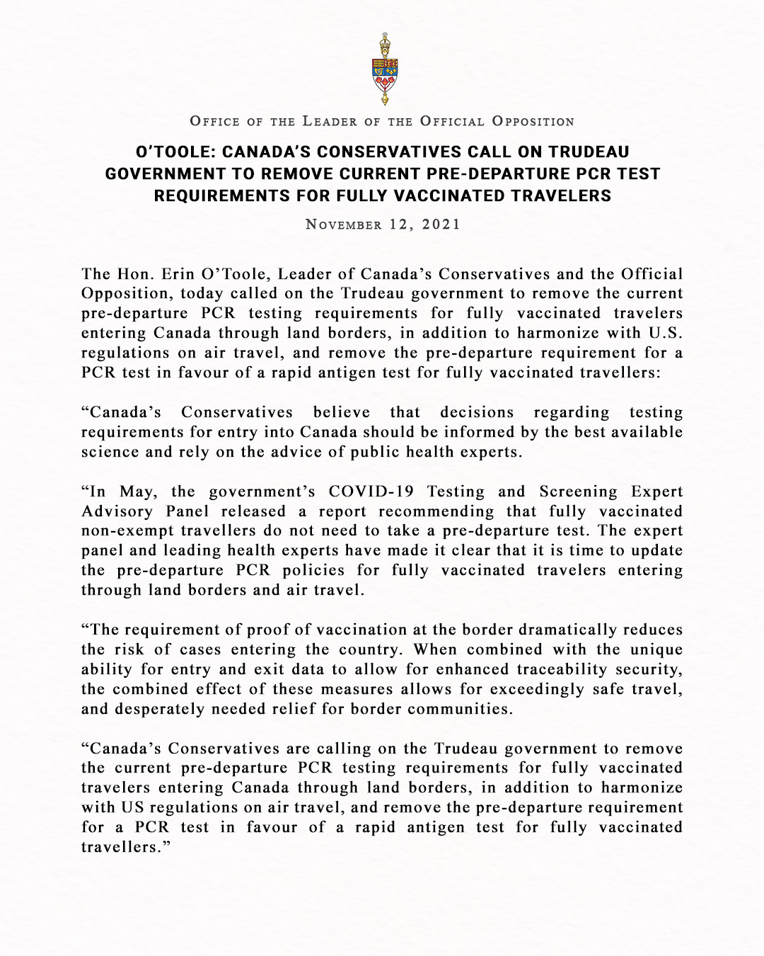 Erin O Toole On Twitter Canada S Conservatives Call On Trudeau Government To Remove Current Pre Departure Pcr Test Requirements For Fully Vaccinated Travelers Https T Co G9nu1scvbd Twitter